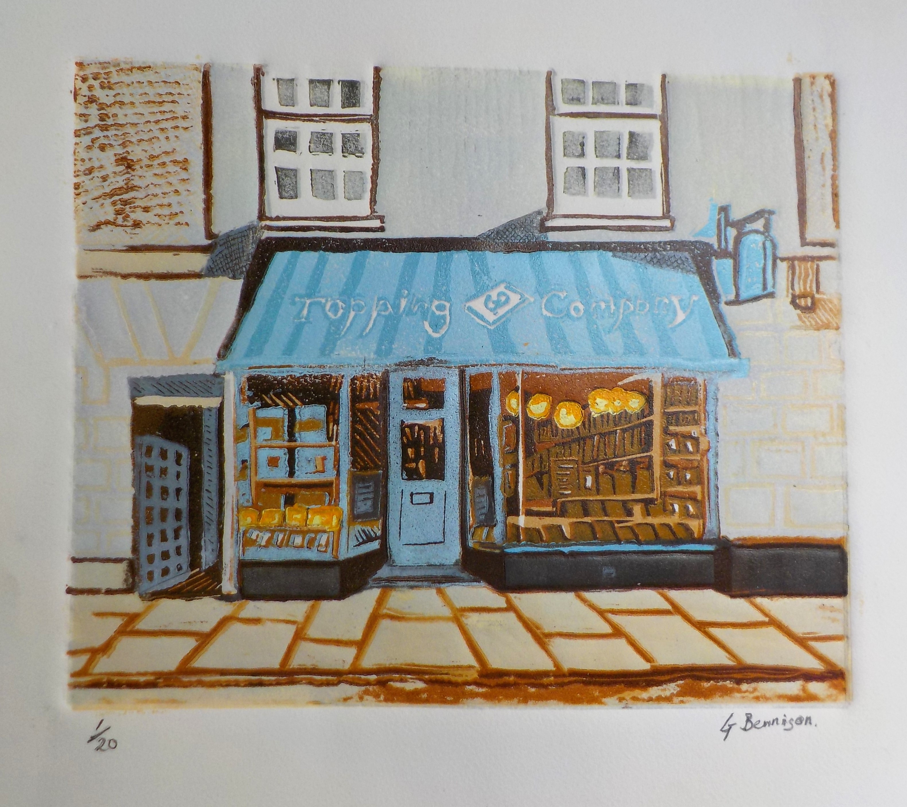 Lino-cut. ‘Toppings Bookshop.’ Toppings is a popular bookshop in Greyfriars, St Andrews. This is an original hand-made lino-cut printed from the block, many separations. The actual image size is 12″ x 9″. An edition of 20 numbered and signed. The second pic shows the lino-cut in a mount. Price £40 plus p and p. on Etsy BUT £35 to friends on this site.