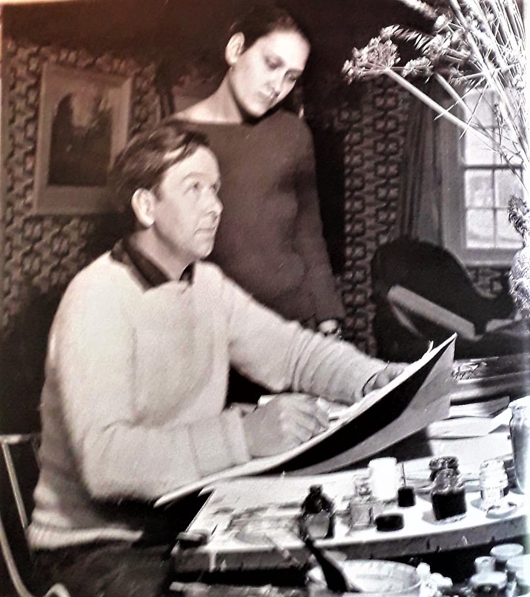 Aged 19 Denise, keen to improve her English, travelled to London in 1954 to become an au pair for a young boy Fairless, his parents Standish and Dodie Masterman lived in a large white stuccoed house near Regents Park. Dodie was an artist and illustrator and once Vogue model who had a passion for the imagery of the toy theatre. These new employers, friends of Michael Rothenstein, were keen patrons of the arts and they all travelled to Essex to see the first exhibition of “Great Bardfield at Home Artists”. The Masterman’s were so impressed by the artist’s homes that they suggested Denise should return to visit the village the following weekend. So, it was here, only a few weeks after arriving in England, that she met Walter Hoyle impressed by his watercolours of Sicily. They decided to meet again at Lyons Corner House, Tottenham Court Road and were soon meeting regularly, they married a year later. The newlyweds moved to Great Bardfield in Essex where Denise became a close friend of Swiss textile designer Marianne Straub who moved from Braintree to Great Bardfield in 1953.